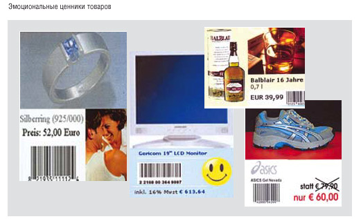 В результате респонденты, которые оценивали товары с эмоциональными ценниками, продемонстрировали значительно более высокую симпатию к продукту, нежели респонденты, оценивавшие товары со стандартными ценниками. При этом самая большая разница в показателях наблюдалась при оценке TFT монитора — 21%.Улыбка вызывает в человеческом мозге генетически обусловленный процесс: выброс гормонов счастья. Изображение влюбленной пары увеличило привлекательность продукта на 7%,а бутылки виски — на 5%.Ценник с указанием цены со скидкой (с _ 79,90 до _ 60)привел к четырехпроцентному увеличению привлекательности продукта. Таким образом, розничной торговле представляется возможность посредством эмоционального инструментария создавать <очаги притяжения> ко всем стратегически важным местам в магазине, повышать коммуникативную эффективность ассортимента, тем самым увеличивая оборот. Это подтвердил и эксперимент, проведенный в одном из швейцарских мультибрендовых бутиков. Целью исследования был анализ поведения покупателей в отделе с эмоционально визуализированной верхней одеждой от Mexx.