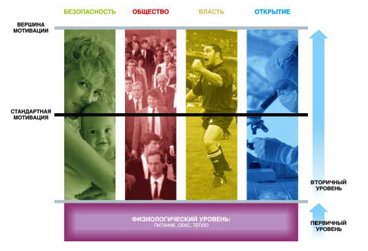 Например, у потребителей с социальными мотивами развиты чувство привязанности и способность к эмпатии. Людей с мотивом альфа характеризует стремление к лидерству (у этой группы наблюдается более высокий уровень тестостерона в крови). Ориентированы на безопасность чаще всего женщины и люди в возрасте (в ходе неврологических исследований у этой группы были выявлены унаследованные страхи). Открывателями чаще всего являются дети и молодые люди, которым присуща врожденная тяга к познанию нового и любопытство.
