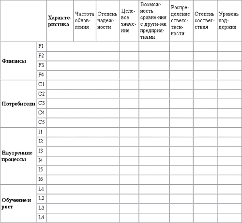 хорошая ССБ должна включать как результирующие показатели, так и движущие факторы. Две верхних группы показателей (Финансы и Потребители) будут в основном результирующими показателями. Нижние группы показателей (Внутренние процессы и Обучение и рост включат отдельные показатели движущих факторов. Группа Обучение и рост может включить несколько таких показателей. Данная таблица группирует показатели и сравнивает оба типа показателей.