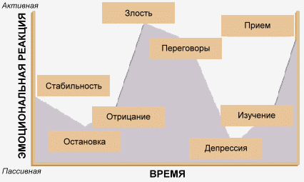 Рисунок # 2 показывает неудачный случай — реакцию людей, когда они считают перемены плохой идеей. Рисунок основан на работе Dr. Elisabeth Kubler-Ross и ее выпущенной в 1969 году книге «On Death and Dying», где были определены стадии, через которые проходят неизлечимые больные. Эти же стадии можно применить и к нашим проектам организационных перемен: