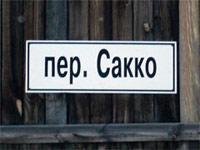 Примерами табличек, содержащих только название улицы (переулка, проспекта) или только номер дома служат прямоугольная (пер. Сакко) и квадратная (№ 20) соответственно. Сейчас эти таблички — о том, о сём. Адрес получится, если их сложить вместе.