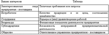 Каждая организация, выступая в роли поставщика, имеет пять групп заинтересованных лиц: потребители, сотрудники, владельцы, субподрядчики (предприятия — поставщики комплектующих) и общество. Деятельность поставщика по обеспечению качества связана с нахождением компромисса между интересами всех этих заинтересованных лиц. Эти интересы можно представить в виде таблицы.
