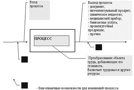 Процесс, преобразуя объект труда, добавляет его стоимость. Каждый процесс включает определенным образом ресурсы, в том числе трудовые. На входе и выходе процесса, а также в различных фазах процесса могут проводиться измерения. Требования к системам качества в соответствии со стандартами ИСО 9000 могут быть применены ко всем четырем категориям продукции. Пожалуй, важнейшим моментом ИСО 9000 является то, что требования к системам качества по существу одни и те же для всех общих категорий продукции, различаться могут лишь детали административного построения и управления системами да терминология.