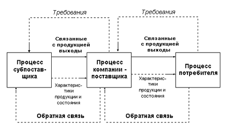 На Рис. 2 представлены отношения поставщика с субпоставщиком и с потребителем в цепочке поставки продукции (любой из 4-х общих категорий). Следует учитывать, что потоки продукции и информации, отображенные на рисунке, также представляют собой процессы. Общее руководство качеством достигается через управление процессами в организации.