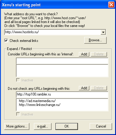 Запустив программу, выбираем в меню File пункт Check URL (Проверить URL). В результате откроется диалоговое окно Xenu’s starting point (смотрите иллюстрацию). Первым делом укажем страницу, с которой Xenu начнет исследование гиперссылок. Это может быть адрес (URL) стартовой страницы нашего сайта — например, http://www.oursite.ru/. Точно так же можно указать отдельную страницу сайта — например, http://www.oursite.ru/page.html/. Наконец, это может быть HTML-документ, сохраненный на жестком диске локального компьютера — например, file:///D:\probe.html. Теперь зададим область исследования. Должен ли Xenu проверять работоспособность ссылок, которые уводят за пределы нашего сайта? Если должен, то поставим отметку в поле Check External Links. Затем перечислим адреса, которые имеют прямое отношение к нашему сайту, хотя и не соответствуют URL главной страницы. Например, к внутренним страницам отнесем все те, адреса которых начинаются с http://forum.oursite.ru, то есть главные страницы разделов нашего сайта. Наконец, перечислим начала адресов, которые совсем не нужно проверять. Это могут быть адреса счетчиков (например, http://top100.rambler.ru) или баннерных сетей (например, http://www.linkexchange.ru). |