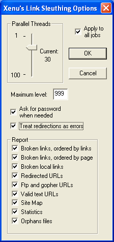 В принципе, все готово, можно начинать анализ гиперссылок. Однако стоит сразу выполнить некоторые дополнительные настройки, воспользовавшись кнопкой More options. Здесь пользователь указывает, какие данные должны быть включены в результирующий отчет, о котором я расскажу чуть ниже. Однако сразу обратите внимание на последнюю строчку в этом окне: Orphan files. В Xenu есть функция обнаружения файлов-сирот (orphan). Прежде чем запускать ее, программа спросит логин и пароль доступа к вашему веб-серверу или к вашей папке на се |