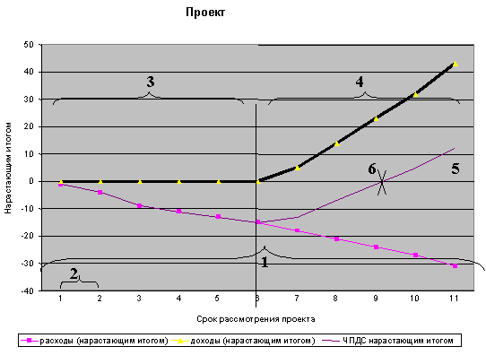 Чистая текущая стоимость проекта (NPV). Показывает накопленный дисконтированный