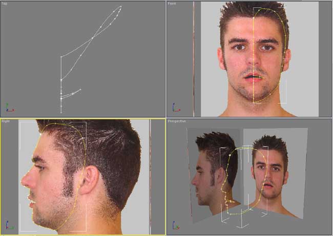 6. Теперь во всех окнах отключаем отображение сетки. Далее, для упрощения, я буду показывать действия вот таким образом — Create>Shapes>Line, чтобы было поменьше писанины. 7. итак! Create>Shapes>Line. Активизируем окно вида Right и нажимаем клавишу w, чтобы развернуть его на весь экран. Создаем сплайн по контуру головы, а точнее лица. Когда последняя и первая вершины сойдутся, МАХ задаст вопрос — Close Spline? Отвечаем нет и щелкаем правой кнопкой мыши, чтобы закончить рисовать линию. Получится примерно вот так —