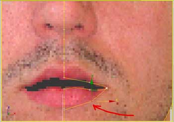 Колличество вершин значения не имеет, потому что потом мы будем удалять, или добавлять вершины по мере надобности. 8. Теперь нам надо придать сплайну объем. Modify>Sub object>Vertex. Выделяем угловую вершину рта и в окне проекции Front перетаскиваем ее в угол рта.