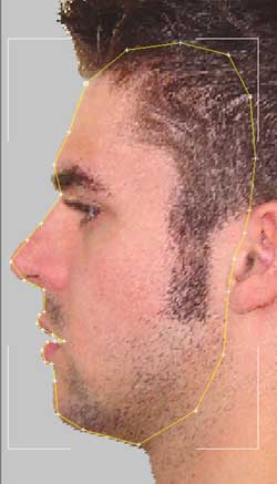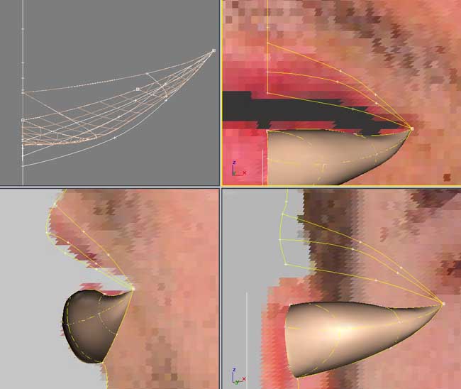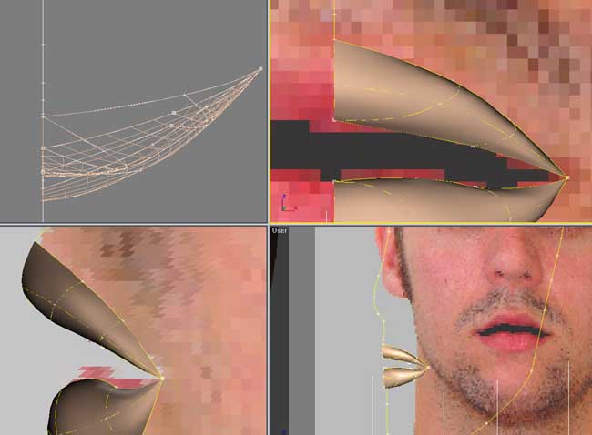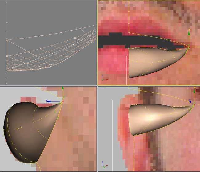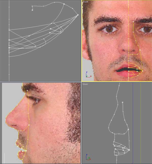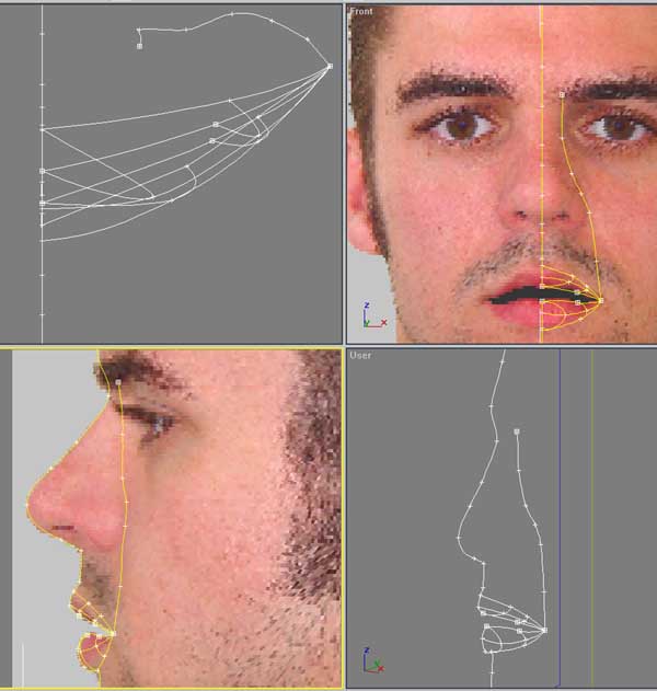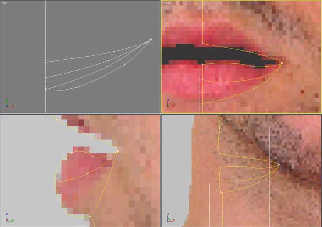 16. Теперь займемся верхней губой. Все операции в точности такие же, как и с нижней. Проводим две линии из угла рта к соответствующим точкам верхней губы, затем перетаскиваем четыре средние вершины в правильное положение в окне проекции Front, переходим на подуровень Spline, выделяем новые кривые, кликаем правой мышкой и выбираем Curve. Должно получиться что-то подобное —