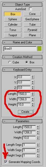 3. Закрываем Material Editor, щелкаем правой мышью в окне проекции Front, чтобы активизировать его. В закладке Create щелкаем на Box, открываем свиток Keyboard Entry и вводим параметры высоты и ширины, которые записали ранее. В Поле Height вводим произвольное значение. Ставим галочку на Generate Mapping Coords. Нажимаем кнопку Create, затем набираем на клавиатуре комбинацию клавиш Ctrl+Shift+z, чтобы отобразить получившуюся плашку во всех окнах.