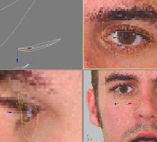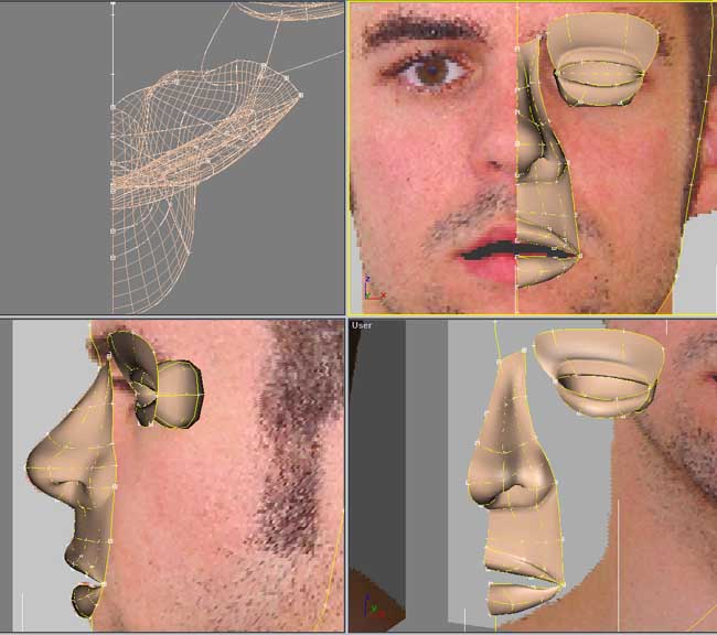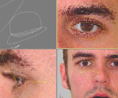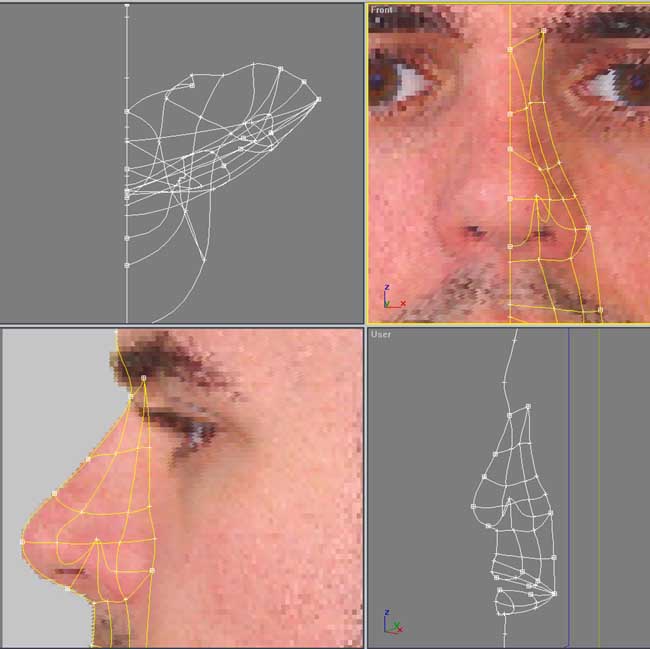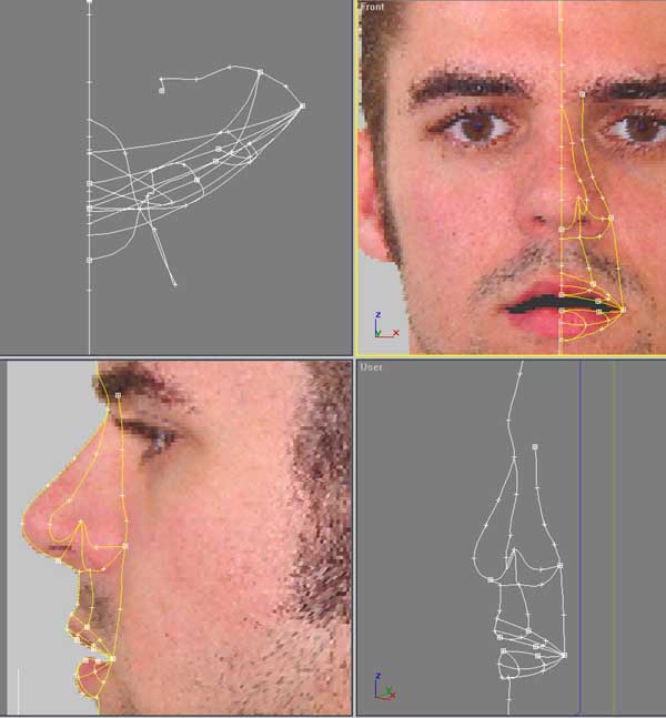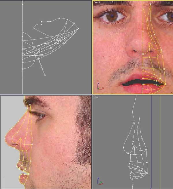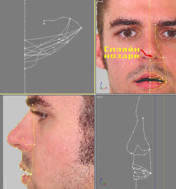 22. Вот ряд рисунков сплайнов носа, по мере их создания. Я спрятал ссылку Line02, чтобы вам было понятнее —