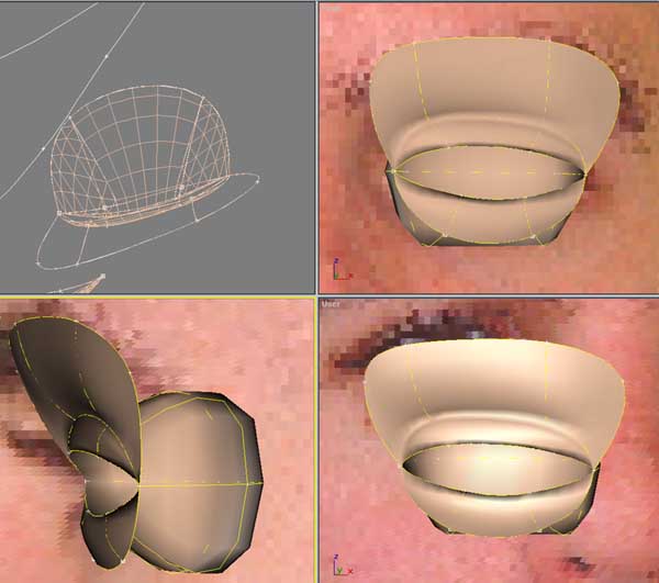 15. Вновь созданной ссылке назначаем модификатор Surface и внем оставляем все настройки по умолчанию. Мы видим нашу нижнюю губу! Теперь при добавлении новых сплайнов, вы будете наблюдать, как поверхность шаг за шагом покрывается «кожей». Нажмите клавишу «H» и выделите из списка Line01. Перейдите на уровень Vertex и отредактируйте до конца кривые, чтобы они приняли соответствующий вид —