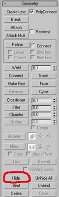 21. Спрячем пока сплайны, образующие глаз. Перейдем на подуровень Spline, выделим все сплайны глаза и в свитке Geometry модификатора нажмем Hide.