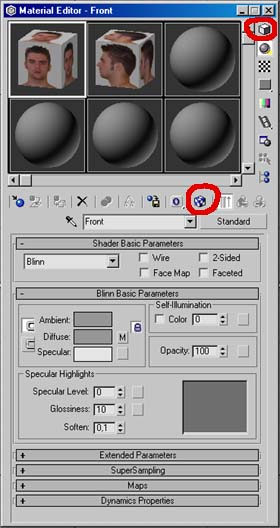 1. Ну вот. Фотографии готовы. Запускаем MAX! Открываем Material Editor и в первый слот кладем на Diffuse нашу фотографию фас. Называем материал — Front. На слот рядом кладем на Diffuse фото в профиль и называем материал — Side. И в первом и во втором слотах нажимаем кнопочку Show Map in Viewport, а в Sample Type выбираем куб.