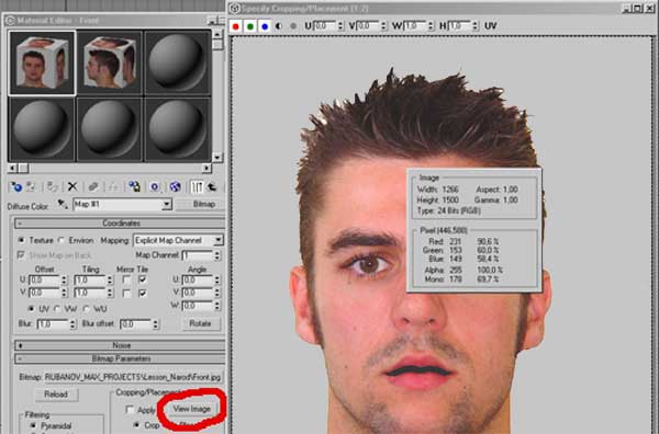 2. Теперь нам нужно создать плашки, на которые мы наложим фото. В Material Editor активизируем первый слот, открываем свиток Maps, кликаем по кнопке справа от Diffuse Color и в свитке Bitmap Parameters кликаем не View Image. Кликаем на изображении правой кнопкой мыши и удерживаем ее. Запоминаем, или записываем ширину и высоту имиджа. Они пригодятся нам для создания плашки.