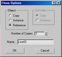 14. Теперь применим одну маленькую хитрость, для того, чтобы нам было удобнее продолжать. Выключаем режим Sub Object, Нажимаем клавишу Shift и удерживая ее кликаем на наш сплайн. В появившемся окошке отмечаем Reference, и ничего больше не меняя, нажимаем ОК.