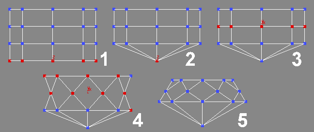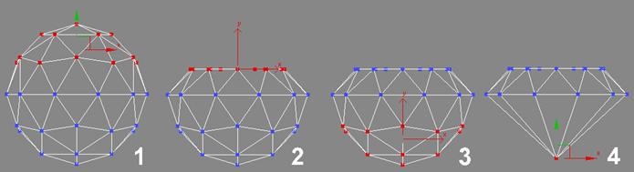 После сделайте Scale и подвинте все выделенные вертексы чуть-чуть вниз (IMG1 — 2). Теперь выделите все вертексы ниже среднего (IMG1 — 3) и тамже, где ранше был Make Planar нажмите на Collapse (IMG1 — 4). Вот почти и все. Отредактируите геометрию по своему вкусу и если количество вертексов и фейсов имеет большое значение для вас, то активизируите редакторе подобектов раздел Poligon, выделите все верхние фейсы (IMG 2) и удалите их.