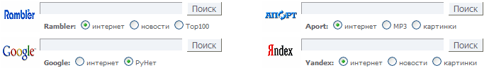 Чем не целесообразна такая поисковая форма? Функции одной поисковой системы дублируются четырежды. Зачем искать в четырёх поисковых системах одновременно, если можно поискать в одной, наиболее мощной? Можно было бы сделать эту систему более полезной, дав возможность поиска отраслевой информации, которую наиболее эффективно позволяет искать только отдельно взятый поисковик. Например, Яндекс ищет по новостям и рунету, Апорт — mp3, Google — по интернету, Rambler — Top100. Кроме того, допускается, что интересы посетителя шире интересов того, кто делал эту систему. Поэтому кроме представленных рубрик посетитель, возможно, пожелает поискать по энциклопедиям, интернет-блогам или по товарам. Не надо пытаться интересы пользователя сузить — не получится. А вот потерять засчёт этого недостатка часть аудитории — легко.