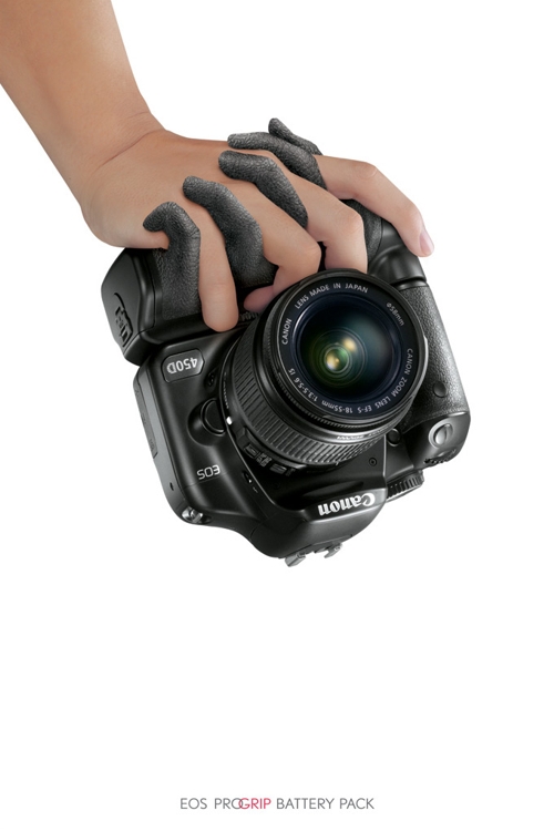 Однако, в первую очередь рекламный принт посвящается особым комфортным характеристикам новой батарейной рукояти Pro Grip для фотокамеры Canon EOS, которая позволяет производить съемку из самых разнообразных углов без особого труда и опасений выронить фотокамеру.