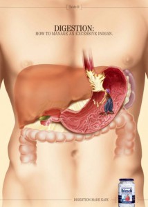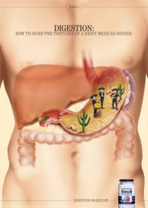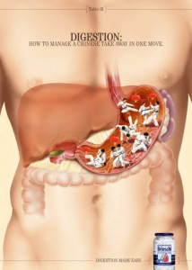 Когда желудок начинает вытворять чудеса, то можно представить всё возможное, что там может происходить. Ведь если человек лишается возможности полноценно насладиться вкусом пищи, то его фантазия может начать работать в достаточно «оригинальном» направлении. Развивая «воображение» потенциальных клиентов, компания производитель медицинских препаратов для желудка и кишечника, поселило в главную ёмкость человеческого организма самых разнообразных персонажей. Глядя на рекламу с подобными сценами, человек, испытывающий неприятные ощущения в желудке, может наглядно представить какие-такие персонажи у него там резвятся. Ах вы, колики-каратисты, романсьеро, наводящие безаппетитное уныние и факир – причина всех изжог, — на вас теперь есть управа. Оригинально, весело и доходчиво. По большому счету существует особый стиль рекламного позиционирования продукта, заключающихся в персонификации каких-либо процессов, которые если описывать в их первичном смысловом контексте, то — может выйти, даже не скучно, а немного неприлично. Но главное в подобной «метафорической» подаче рекламного смысла выдержать чёткую стилистическую грань.