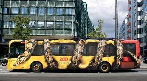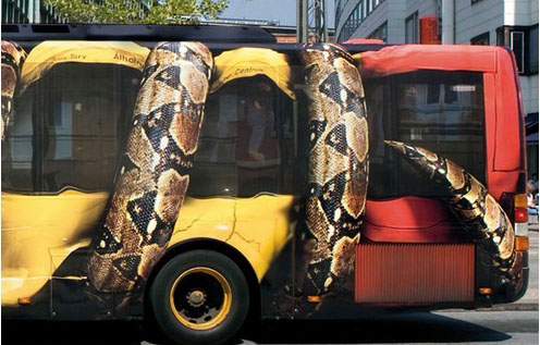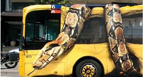 И в этом случае рекламная кампания не обошлась без иллюзионного, в данной рекламе, изображения огромной рептилии, которая буквально «обволакивает» автобус. При этом, увидев подобную иллюстрацию, каждый может невольно вообразить реальность происходящего поглощения громадной змеей беззащитного автобуса. Однако, на самом деле, это всего лишь довольно удачный рекламный ход по популяризации зоопарка.