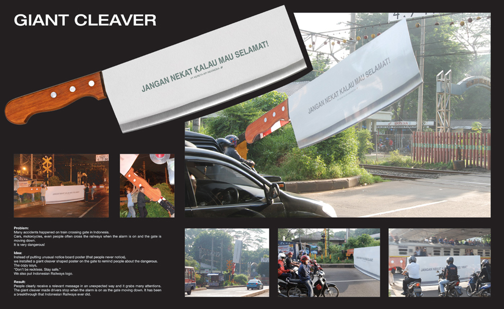 В Джакарте, что находится в Индонезии, креативное рекламное агентство EURO RSCG Adwork пришло на помощь работникам железной дороги, разработав проект нового шлагбаума. А креатив выражается в том, что теперь шлагбаум на станции Kalibata выглядит как нож — тесак.