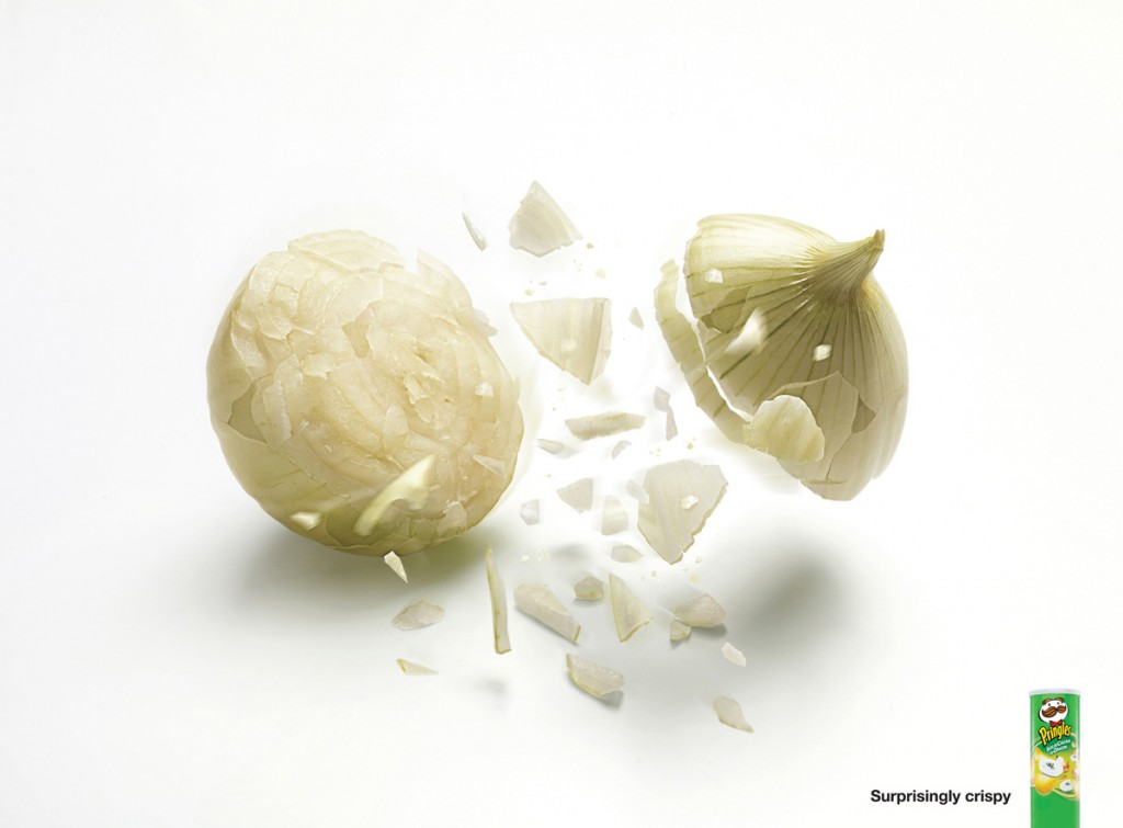 Итак, если учесть все предлагаемые советы, то получим серию рекламных плакатов, созданную рекламным агентством Grey специально для рекламы чипсов Pringles. На плакатах изображены такие продукты питания, как сыр, лук и красный перец. Но это не просто продукты, отражающие вкусы чипсов, это сами чипсы. Ведь на картинке они такие же «удивительно хрустящие» как сами чипсы Pringles.