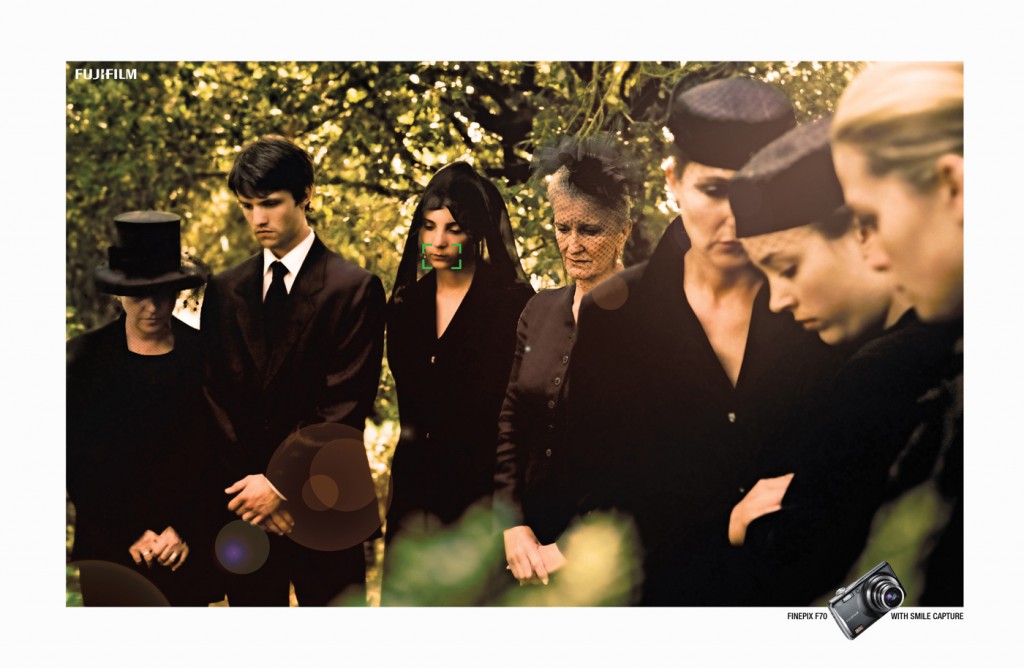 На помощь приходит новый фотоаппарат FinePix F70 компании Fujifilm с функцией распознавания улыбок. На серии рекламных плакатов, созданной индийским рекламным агентством RMG Connect специально для Fujifilm изображены обыкновенные бытовые ситуации: ребята играют в покер, парень провожает девушку в аэропорту, похоронная процессия провожает кого-то в последний путь. Все довольно обычно, ничего примечательного, если бы не одно но. Губы некоторых персонажей выделены зеленым прямоугольником, наподобие того, которым выделяются улыбки при использовании функции распознавания в цифровом фотоаппарате. Выходит, что новый фотоаппарат от компании Fujifilm может больше, чем любой другой цифровой фотоаппарат. Он умеет читать мысли тех, кто пытается скрыть улыбку. Плакаты как будто призывают: «Улыбайтесь, господа. Нет смысла что-либо скрывать. Вас снимает FinePix F70».