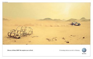 Целью рекламных постеров является донесение до потребителя мысли об автомобиле-победителе, эксплуатация которого возможна в самых невероятно тяжелых условиях, вопреки жаре, песчаным бурям и другим катаклизмам. В сложнейших ситуациях, когда другие модели давным-давно приказали долго жить, и от них уже остался только тлен, Volkswagen Taureg стойко движется к победе, оставляя пыль позади себя, и все-таки добивается успеха.