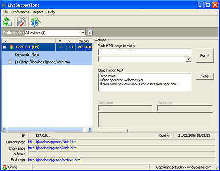 Для удобства работы оператора в этом же окне отображается адрес страницы, на которой находится посетитель. При переходе на другую страницу эта информация изменяется. Оператор, безусловно, не может знать, когда посетитель прекратит общение. Посетитель может закрыть окно чата, но информация об этом оператору не поступает. Возможность определить эту ситуацию появляется только тогда, когда оператор отправляет свой очередной ответ и, если окно чата закрыто, получает информацию, что посетитель прекратил общение. Каждый оператор может получить по результатам своей работы отчет о количестве посетителей, в том числе тех, с кем было у него общение. Эти данные можно сформировать за интересующий вас период, а также отобрать только тех посетителей, с которыми общение состоялось. Ну а дальше начинается анализ состоявшихся разговоров, анализ интересовавших посетителей вопросов, возможно, доработка сайта для более удобной подачи информации. Результаты такого общения могут сказаться не сразу, но если в конечном счете они приведут к увеличению продаж, количества предоставляемых услуг — значит, этот сервис свое предназначение выполнил.