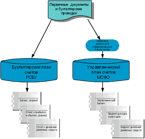 Основой для ведения учета как по РСБУ так и по МСФО является план счетов. Необходимо создать такой управленческий план счетов в соответствии с МСФО, который позволял бы выбирать информацию из бухгалтерского плана счетов (БПС) и относить ее на счета управленческого плана (УПС).