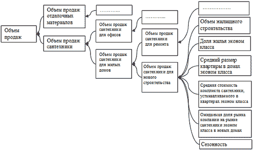 Показатель объема продаж компании не является однородным, так как зависит от большого числа факторов (демографические условия в данном регионе, состояние отраслей, в которых производятся товары-заменители и т.д.), значения которых в будущем могут значительно изменяться. Поэтому, если мы будем прогнозировать продажи, основываясь только на данных предыдущих периодов, наш прогноз с большой вероятностью будет неточным. Для принятия решения относительно будущего объема продаж необходимо определить все факторы, которые могут повлиять на прогноз (релевантные факторы) (см. Рисунок 1). Если компания не является монополистом, в число таких факторов следует включить долю рынка, которую компания рассчитывает занять в рассматриваемый период времени.