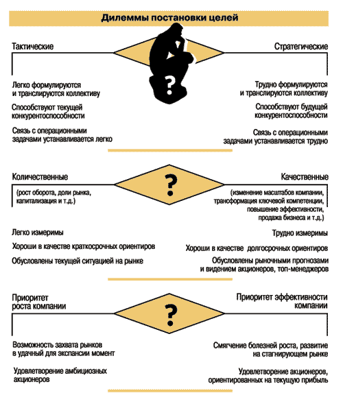 Таким образом, кризис целей, который мы упомянули, можно считать кризисом взросления бизнеса, то есть позитивным явлением. Руководители фирм прощаются с иллюзиями, откладывая бесполезные стратегические документы, и пытаются заново сформулировать свои задачи, зачастую пока в голове, без фиксации в меморандумах. Еще важнее, что компании постепенно осознают: необходимо обеспечить связь между стратегическими целями, тактическими среднесрочными задачами, годовыми целями всей компании и работой каждого сотрудника. Попутно надо разрешить ряд дилемм, которые неизбежно возникают в процессе постановки целей, и речь о них пойдет дальше.