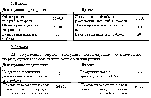 Линия, размещаемая на существующих площадях, "создала" незначительный прирост затрат на освещение цеха и потребление воды, затраты на ремонт нового оборудования. Затраты на отопление цеха, содержание прочих цехов, общехозяйственных зданий, амортизация существующих до проекта фондов и сооружений не изменились. Несколько возросли затраты на ремонт оборудования прочих цехов, задействованного при производстве нового продукта (их загрузка возросла). Только дополнительные затраты (равно как и дополнительные доходы) должны рассматриваться при оценке прибыльности проекта и расчета показателей его эффективности.