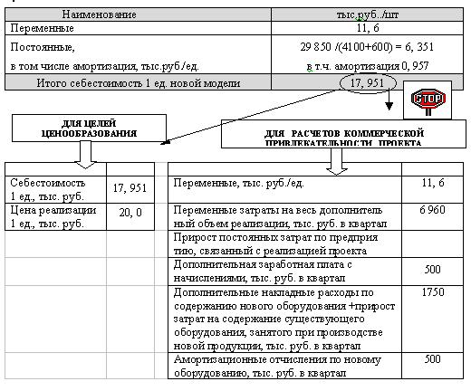 Себестоимость продукции объединяет в себе затраты как уже существующие, так и вновь возникшие в связи с реализацией проекта — соответственно, не позволяет определить дополнительную прибыль, которую приносит проект предприятию — не позволяет корректно оценить его эффективность. Таким образом, для оценки эффективности проектов, реализуемых на действующем предприятии, необходимо оценивать приросты затрат (и доходов), связанных с реализацией проекта. При оценке прироста переменных затрат использование себестоимости единицы оправдано (такой расчет аналогичен расчетам через норму расхода ресурса и его цену). Изменение постоянных затрат необходимо оценивать по каждому элементу затрат в абсолютных величинах за определенный период времени.
