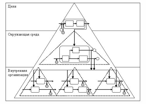 В результате такого моделирования строятся управляющие процессы, являющиеся ортогональными к процессам оперативной деятельности. То есть переход от уровня к уровню понимается именно как процесс, а на графической схеме получается два ортогональных направления процессов: одно (горизонтальное) оперативное, второе (вертикальное) управления. Причем информацией для вертикального процесса, кроме внешней информации, является результат процессов последующих уровней, в то время как результат процесса предыдущего уровня является управляющей информацией для процессов последующего уровня, таким образом, реализуется управляющая обратная связь. Таким образом, при описании в виде схемы любой бизнес-процесс не должен пониматься плоским и однонаправленным, каждый процесс должен быть связан с другим ортогональным управляющим процессом. Предложенный подход ориентирован на раскрытие целостности организации и обеспечивающих ее механизмов, на выявление многообразных управляющих связей, и реализует представление организации в виде иерархической модели, позволяющей фиксировать целостные свойства компании.