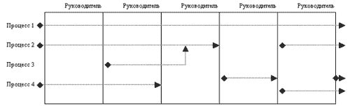 Тогда на стыках отделов проявляются не полностью совпадающие интересы смежных структур, в увязке которых эти структуры весьма заинтересованы. Результатом увязки становится работоспособный компромисс — процедуры взаимодействия, устраивающие обе стороны до тех пор, пока способствуют достижению общего результата, и пока четко соблюдаются. нарушение сроков или качества в передаче продукта (товара, информации, услуги) от подразделения к подразделению сдвигает баланс интересов, поэтому сразу становится предметом разбирательства, инициируемого «ущемленным» отделом. То есть, как сам бизнес-процесс реализуется разными функциональными подразделениями, так и контроль за его качественным выполнением является распределенной функцией, осуществляемой подразделениями по зонам ответственности.