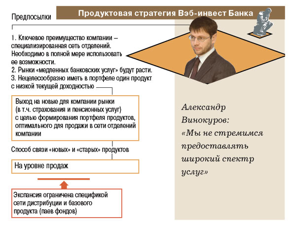 интересно проследить логику такого подхода. Когда два года назад Вэб-инвест Банк начал продавать паи фондов, "оказалось, что в России нет сети, подходящей для их реализации", — рассказывает Винокуров. Банк построил такую сеть, и она ему понравилась. "Мы считаем сеть, через которую можно качественно дистрибутировать довольно сложные финансовые услуги, нашим сильным конкурентным преимуществом, — подчеркивает руководитель компании. — и нам стало обидно, что через эту сеть реализуется всего один продукт, — мы захотели полнее ее использовать. С другой стороны, мы давно планировали предложить физическим лицам что-то кроме паевых фондов". Совпадение двух желаний вылилось в идею, которую Винокуров сформулировал так: найти продукты, дающие синергетический эффект при продаже вместе с паевыми фондами в конкретных отделениях. И уже потом в банке решили, что это будут карты, услуги страхования и т.д.
