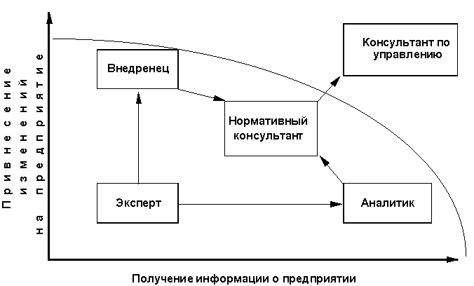 Создание консультантом единого "образа настоящего-будущего"предприятия означает появление у него определенной системы ориентиров (своей"нормативной модели"), исходя из которой он может действительнообоснованно не только решать поставленные перед ним задачи, но и оказыватьсобственное воздействие на процесс управления предприятием.