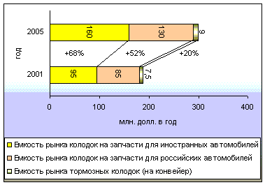 Рынок колодок для иностранных автомобилей в денежном выражении уже сейчас является самым емким. Объем рынка колодок для автомобилей иностранного производства будет расти самыми быстрыми темпами и к 2005 году увеличится н