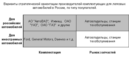 При разработке планов развития серьезно прорабатываются три варианта развития компании (помеченные темным фоном) — это ориентация на работу с комплектацией российских автомобилей, работа на рынке запчастей для российских автомобилей и работа на комплектацию иностранных производителей, которые организуют производство в России. При этом производители комплектующих могут специализироваться на одном из рынков или комбинировать свою ориентацию на комплектацию и на запчасти.