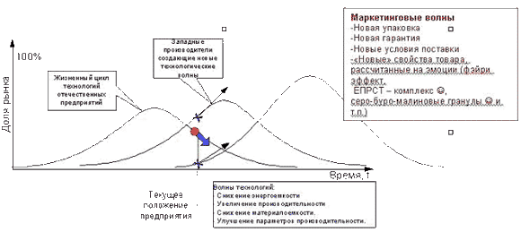 На графике показано, что объем продаж продукции конкурента (западной компании) недавно превысил продажи предприятия (вторая волна ЖЦИ). Кроме того, на последней выставке конкурентами были представлены образцы новой продукции, которая имеет очень хорошие перспективы на рынке РФ (третья волна ЖЦИ).