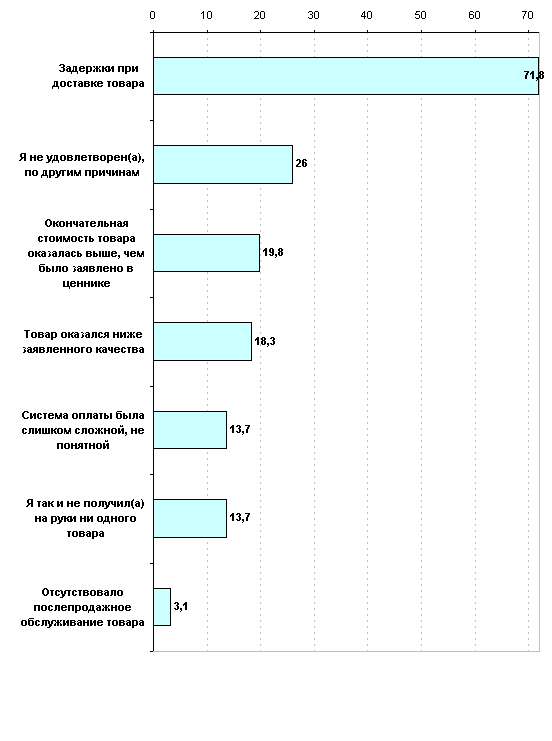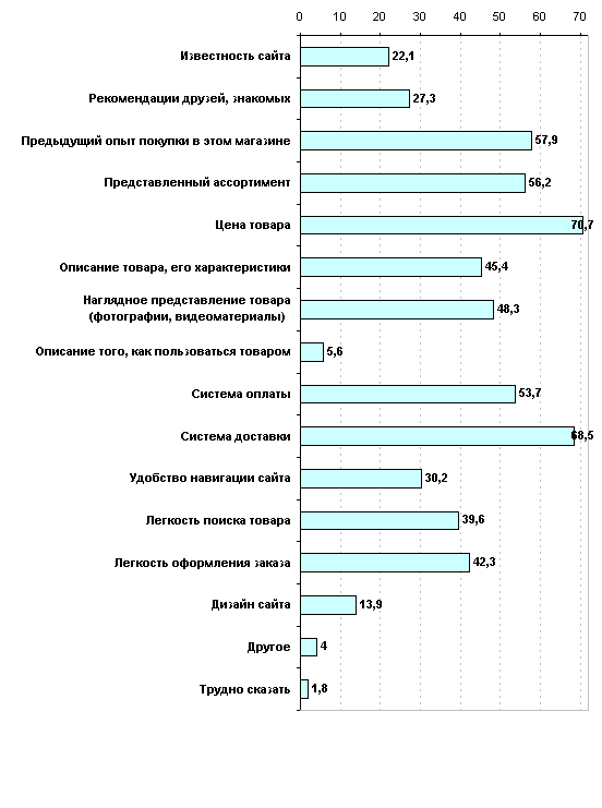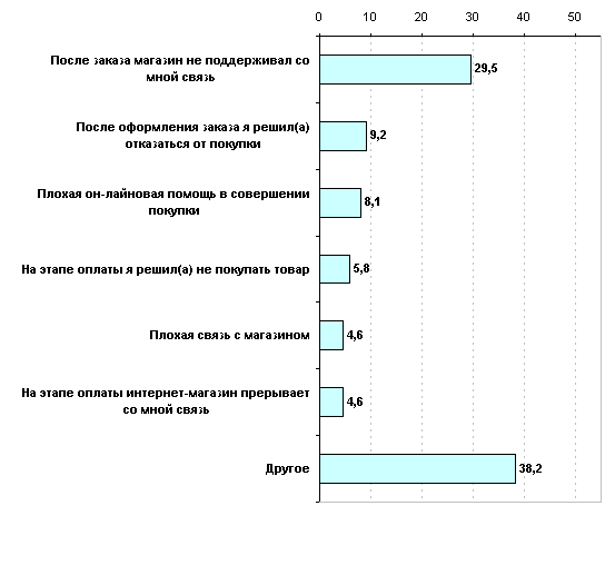 Причины можно разделить на две группы: внешнего характера (зависят не от покупателя, а от сетевого магазина) и внутреннего характера (отказ от покупки после успешного оформления заказа или на этапе оплаты). О том, какая группа факторов доминирует видно из графика. Заметим, что респонденты имели возможность назвать свою причину несовершения сделки (<Другое>). Названные причины можно так же объединить в несколько групп (в порядке убывания по количеству голосов): отсутствие товара, проблемы логистики, система оплаты, технические трудности, внутренние мотивы покупателя. Как видим, факторы внешнего характера являются основными причинами несовершения покупки.