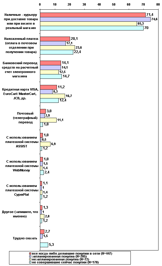 исследование показало, что и у женщин и у мужчин наличие опыта покупок в сети одинаково, всего на момент опроса имели опыт совершения покупок 77% мужчин и 80% женщин. Процесс принятия решения о покупке у мужской части сетевых покупателей более рационален, чем у женской ее части. Так, хотя покупки в сети планируют и женщины и мужчины в равной мере (47,7% и 45% соответственно), однако большая часть женщин совершили незапланированные покупки по сравнению с мужчинами (21% и 14% соответственно). По всей видимости, это говорит о том, что мы имеем дело с явлением, которое отмечалось ранее во многих зарубежных исследованиях: женщины — пользователи интернет — занимают активную жизненную позицию, более склонны проявлять инициативу и добиваться намеченных целей.